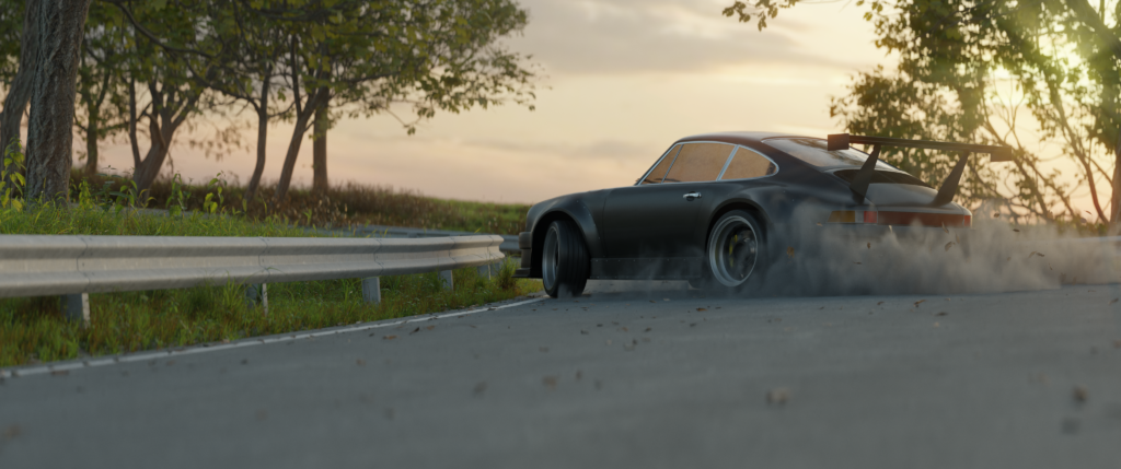 A still render capturing a modded car mid-drift. Focused on realistic lighting, scene layout and environmental debris. Rendered with Cycles.